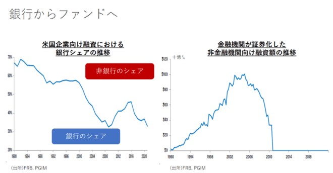 下図左は米国企業向け融資における銀行のシェア推移です。度重なる規制強化によって銀行はリスクの高い融資を控えており、シェアが低下しています。そして銀行による融資シェア減少分を穴埋めしているのがファンド等のノンバンクです。