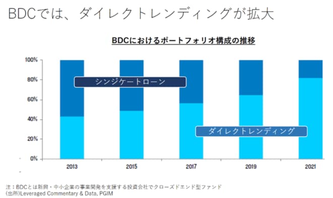 前出のBDC(Business Development Company)は未上場の中堅企業や新興企業等に対して資金供給を行う投資法人であり、クローズドエンド型のファンドです。BDCにおけるポートフォリオ構成の推移を示したのが下図です。2013年は銀行の協調融資であるシンジケートローンが過半でしたが、2021年はDLが8割と変化してきています。