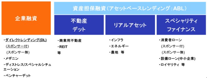 PDの定義は広範に渡り線引きは曖昧ですが、一般的には私募・相対で取引される信用リスクのある取引への投資を指します。こうした特徴から、「プライベートクレジット」と称されることもあります。以前から主流にあるのが主に中小企業を対象とするローンであるダイレクトレンディング(DL)です。その他にもメザニンやディストレスト、スペシャルチュエーション、ベンチャーデットなどがあります。