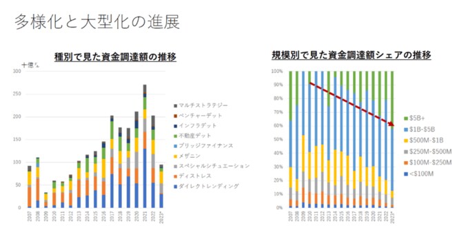 PEとPDの運用資産規模の推移を示したのが下図左で、オレンジがPE、青はPDです。推移を見てみると、PDは企業向け融資を中心として、PEと共に成長してきたことが分かります。