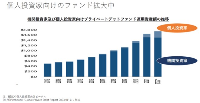 そして、PD市場ではもう一つ大きな流れが進行中です。下図は投資家種別で見たPDファンドの運用資産額の推移です。従前から機関投資家が主流でしたが、最近は個人投資家向けの運用額が拡大しつつあります。日本でもブラックストーンのBDCは日系証券会社経由で販売されており、高いインカムが期待されるうえ、小口化されており、流動性も付与されています。比較的大きな運用機関が大規模な資金調達を行っており、特定の分野では競争の激化が指摘されています。