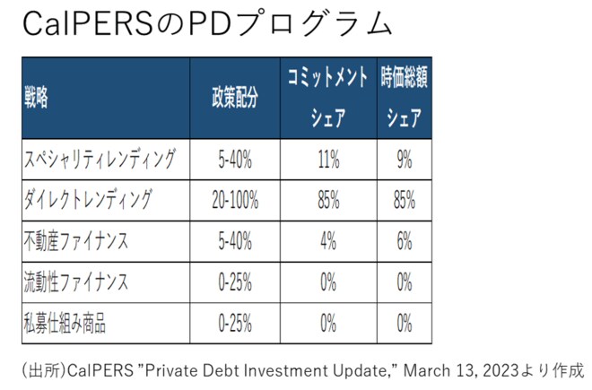 次に、主要な投資家である公的年金の例として、カリフォルニア州職員退職年金基金(CalPERS=カルパース)のPDプログラムを見てみます(下図)。投資目的としては、インカム収入と私募融資の複雑性と非流動性による追加的なプレミアムを期待しています。投資開始は2020年と比較的遅いものの、2022年末で240億ドルのコミットメントをしています。過去3年間で毎年約80ドル投資し、ビンテージ分散を図っていることがうかがえます。プライベートエクイティ(PE)のJカーブ効果をPDの定期的インカムで軽減させることも意図しているようです。