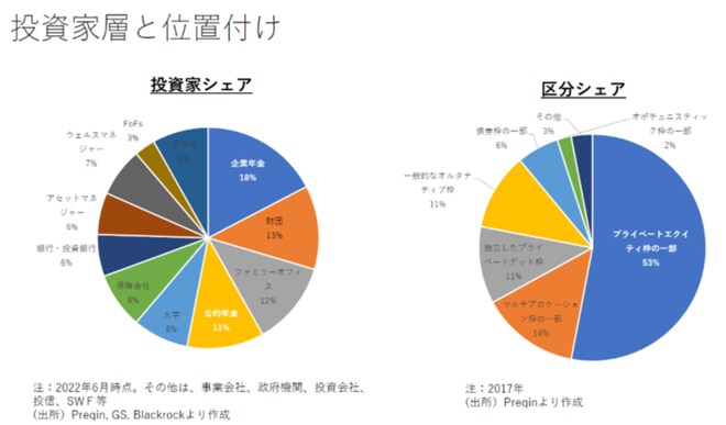 投資家シェアを示したのが下図左です。企業年金が18%、財団は13%、ファミリーオフィスは12%、公的年金は11%、大学と保険会社が8%ずつとなっています。やはり長期投資可能な機関投資家が過半を占めていることが分かります。