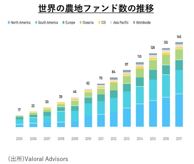 下図は世界の農地ファンド数の推移です。農地ファンドも米国から始まり、各国に拡大しています。