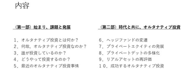 「オルタナティブ投資 発展の歴史」と題し、全10回にわたって解説していきます(下図)。第9回はリアルアセットの再評価をテーマに、前後編の2回に分けて取り上げます。