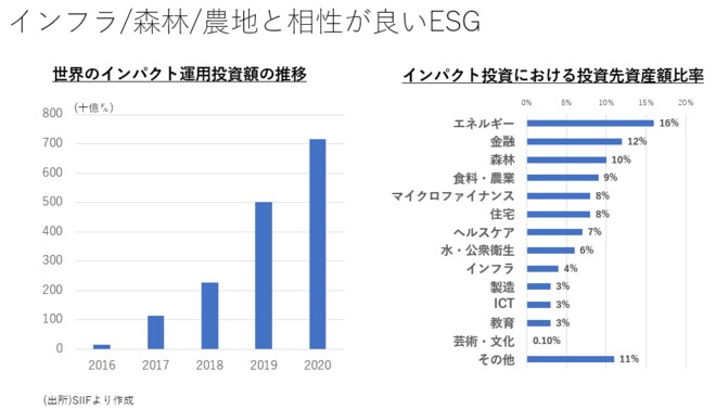 インフラ、森林、農地と言った投資対象は、ESGと非常に相性が良いとも言えます。下図左は世界のインパクト運用投資額の推移で、2017年以降に急激な資産成長になっています。