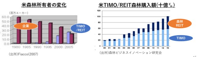 特徴な例として、森林投資の発展を見てみます。米国では、かつて製材・製紙会社が森林を保有し製品化する垂直型の事業を行うのが普通でした。1980年代の税制改革や金融規制の見直しによって森林を保有するインセンティブが低下し、従来融資を行ってきた生保や銀行がTIMOと呼ばれる森林投資管理組織を作り長期投資家である年金等へファンド提供を始めたようです。1992年に第1号のTIMOが設立されています。