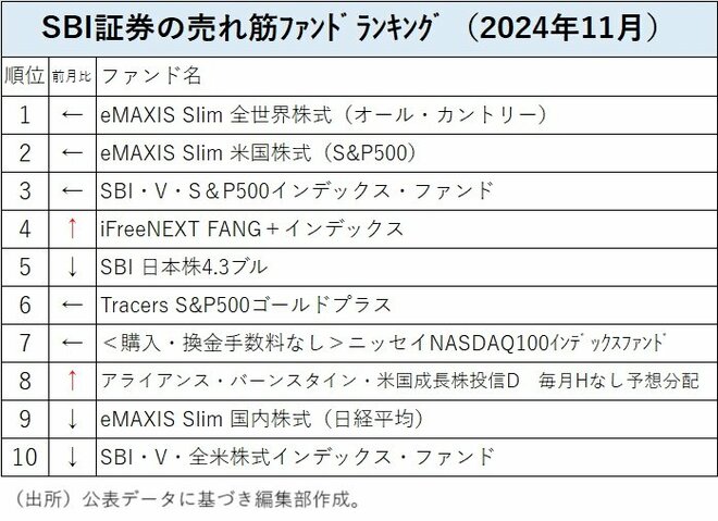 SBI証券の投信売れ筋ランキングの2024年11月のトップ3は前月と同様に「eMAXIS Slim 全世界株式(オール・カントリー)」、「eMAXIS Slim 米国株式(S&P500)」、「SBI・V・S&P500インデックス・ファンド」だった。第4位に前月5位だった「iFreeNEXT FANG+インデックス」が浮上し、第8位には前月第10位だった「アライアンス・バーンスタイン・米国成長株投信D 毎月 Hなし 予想分配」がランクアップした。これに対し、「SBI 日本株4.3ブル」は第4位から第5位に後退し、「eMAXIS Slim 国内株式(日経平均)」も第8位から第9位にランクダウンするなど日本株ファンドへの評価は下がった。