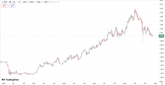 双日は株価の下落が続いています。2024年5月に上場来高値となる4408円まで買われて以降、値下がりの傾向がみられます。同年12月2日までの下落率は30%を超えました。今期(2025年3月期)は利益の進捗が低調なことから、業績への懸念が背景にありそうです。