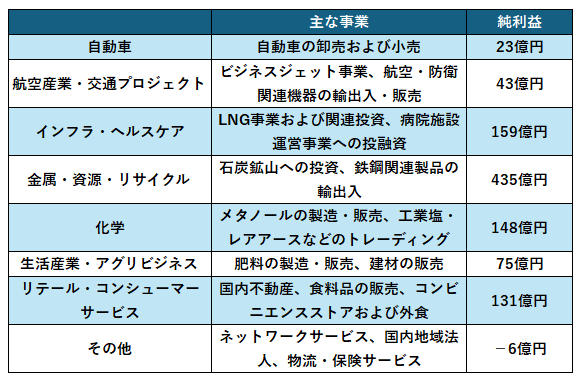 双日の事業セグメントは8つに分かれます。利益の多くは金属・資源・リサイクルが占めています。同セグメントの主要事業は石炭鉱山への投資や鉄鋼関連商品の輸出入などです。また、双日は持分法適用会社に「ロイヤルホスト」を運営するロイヤルホールディングスのほか、さくらインターネットやフジ日本精糖などを持ちます。
