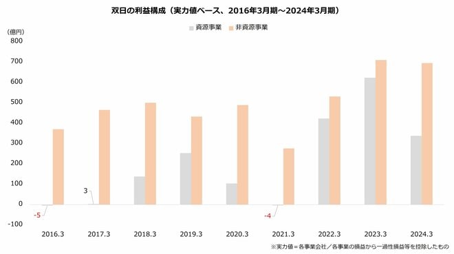 双日は非資源事業の比重が大きいことも特徴的です。一過性の影響を除いた実力値ベースの利益は、非資源事業が過半を占める状況が続いています。総合商社としては、資源市況の影響は抑制的といえそうです。
