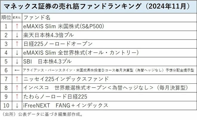 マネックス証券の投信売れ筋ランキングの2024年11月のトップは前月の第2位から「eMAXIS Slim 米国株式(S&P500)」が浮上した。前月トップだった「楽天 日本株4.3倍ブル」は第2位に後退し、前月3位だった「SBI 日本株4.3ブル」は第5位にまで下がった。代わりに前月は第4位だった「日経225ノーロードオープン」が第3位に浮上し、トップ10圏外から「ニッセイ225インデックスファンド」が第7位に、「たわらノーロード日経225」が第9位に入るなど、日経平均株価に連動するインデックスファンドが順位を上げた。