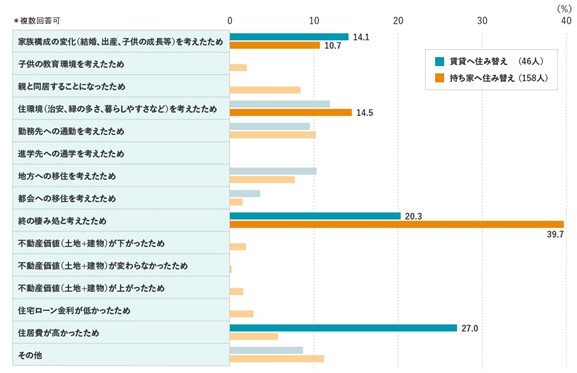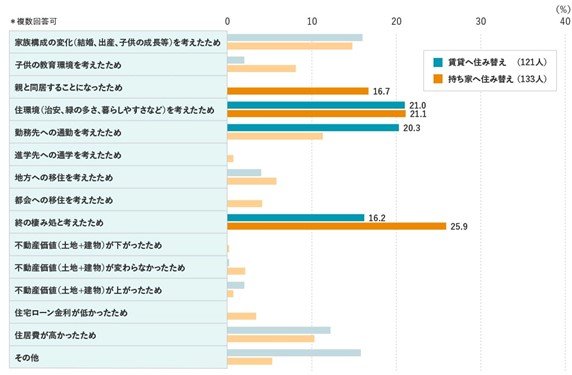その他の理由としては、50代では「住環境を考えて」(21.1%)、「親と同居することになるため」(16.7%)、60代では「住環境を考えて」(14.5%)、「家族構成の変化を考えて」(10.7%)が上位となり、終の棲み処を意識して、自身が心地よく過ごすことができる住環境というところも住み替え(予定)の理由として、重視されている様子がうかがえました。