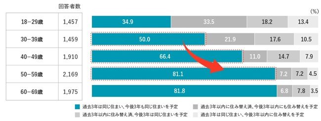「過去は同じ住まい、今後も同じ住まいを予定」と回答している、過去も今後も住み替え(予定)なしの方の割合は、20代(18歳-29歳)では、34.9%と最も低く、30代で50.0%、40代で、66.4%、50代以降は80%超と、これまでの住み替えコラムで見てきたグラフより30代~50代での傾斜が大きいものとなりました。