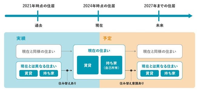 今回ミライ研で実施したアンケート調査では、時系列として、過去の住まい(3年前)・現在の住まい・未来の住まい(3年後までの予定)について伺うことで、その間の住み替えを含む住居形態の変化を捉えることができるような構成としています【図表1】。