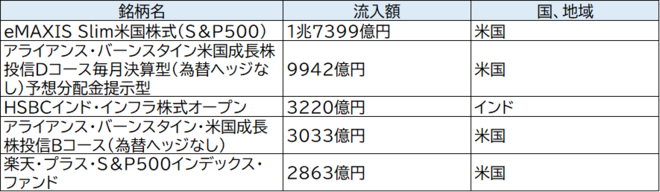 流入額の首位は「eMAXIS Slim米国株式(S&P500)」でした。米国の株価指数「S&P500」への連動を目指す投資信託です。上位5銘柄の4本は、同じく米国株式型が占めています。