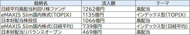1年間の資金流入額は「日経平均高配当利回り株ファンド」が最大となりました。日経平均株価の採用銘柄のうち、予想配当利回りの上位30銘柄に投資するファンドです。