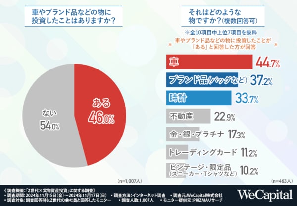 調査によれば、車やブランド品などの物に投資したことが「ある」と回答した人が46.0%に上った。デジタル世代とも呼ばれる彼らの半数近くが実物資産への投資経験者ということで、意外に多いと感じる人もいるかもしれない。