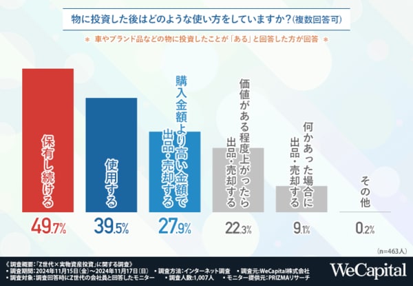 調査によれば、「保有し続ける」と回答した人が49.7%と最多。「使用する」が39.5%と続く。投資目的として購入しつつも、物としてのメリットを享受したいと考える人が多いようだ。