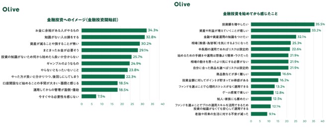 しかし実際に投資をやってみた後だと、「投資額を増やしたい」が35.5%、「資産や利益が増えていくことが嬉しい」が33.2%、「金融や資産運用の知識をつけたい」が32.1%だった。いずれも前向きなイメージが上位を占めている。