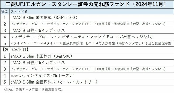 三菱UFJモルガン・スタンレー証券の売れ筋の10月は、「S&P500」、「日経225」、「全世界株式(オール・カントリー)」といった国内外の主要な株式インデックスファンドが大半を占めていた。10月には米国の「S&P500」や「NYダウ」が史上最高値を更新し、ドイツの「DAX」も史上最高値に進むなど欧米の株式市場が好調だった。欧米ともにインフレ率が低下し、それぞれに利下げを実施したという金融緩和への流れが確認されたため、株式市場の先高観が高まっていたためと推察される。