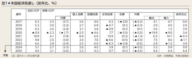 想定以上に米国経済が強かった1年と言えるでしょう。年初の段階ではリセッション入りするとの見方も多かったのですが、実体経済はことのほか堅調で、やや減速した程度にとどまりました。1%台に落ち込むと見られていた2024年の実質GDP成長率も、11月末時点では2.7%に上方修正しています(図1)