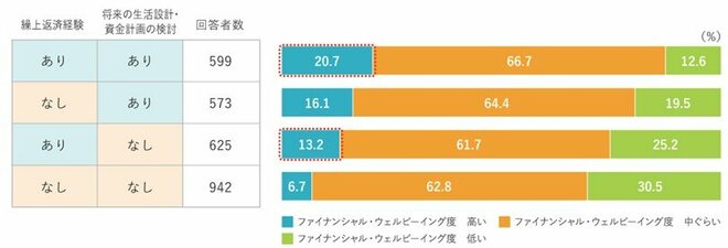 将来の生活設計・資金計画の検討有無、いわゆるライフプラン・マネープランの検討状況を勘案すると、ファイナンシャル・ウェルビーイング度が高い人の割合は、「繰上返済経験あり×将来の生活設計・資金計画なし」では13.2%となっており、 「繰上返済経験あり×将来の生活設計・資金計画あり(20.7%)」だけでなく 「繰上返済経験なし×将来の生活設計・資金計画あり(16.1%)」 よりも劣後する結果でした。