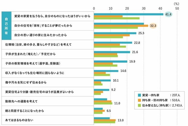 結果としては、どのグループも「自己所有となる点」が最大の理由となっている点は同様ですが、直近3年以内に持ち家を取得した2つのグループでも、「賃貸→持ち家」のグループは「賃貸コストに関する理由」が最大(41.4%)、「持ち家→別の持ち家」のグループでは「夢のため」が最大(32.3%)と、住宅購入時の状況によって最も重視する部分が異なることがわかりました。