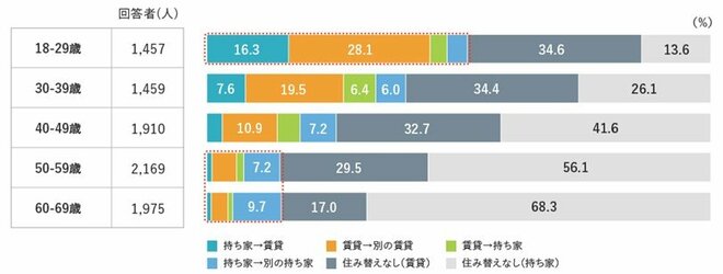 このことからも、住居形態の変化は若年層ほど発生頻度が高く、年代が上がるにつれて現在の住居形態が変わる可能性が少なくなっていることがわかります。