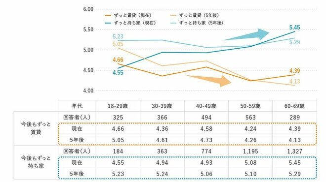 最後に、過去3年間で住まいを替えず、今後3年間も住み替え予定のない、「ずっと賃貸派」と「ずっと持ち家派」の2グループの生活満足度が、年代によってどのような変化があるのかを分析しました。すると、双方20歳代では同水準であるものの、「ずっと賃貸派」では年代が上がるにつれて生活満足度が僅かに減少していることがわかりました。その一方で、「ずっと持ち家派」では、年代が上がるにつれて生活満足度が向上しており、両者を比較した際に、逆の動きとなりました。住居形態によらない年代別の生活満足度では、20歳代と60歳代で生活満足度が高いことがわかりましたが、住居形態を踏まえた年代別の生活満足度ではまた、異なった傾向となることも分かりました。