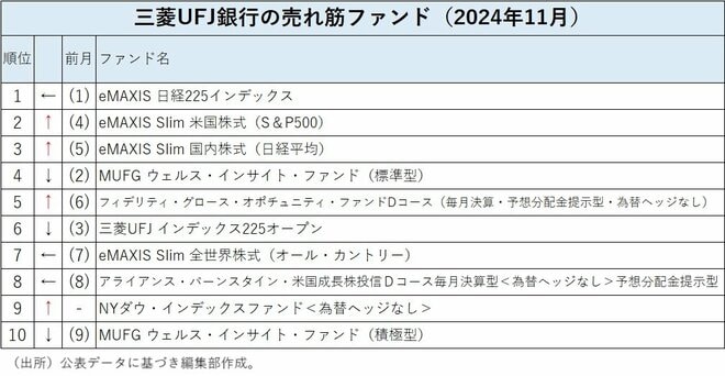 三菱UFJ銀行の投信売れ筋ランキングの2024年11月は、トップに5カ月連続で「eMAXIS 日経225インデックス」になった他、第2位には「eMAXIS Slim 米国株式(S&P500)」、第3位に「eMAXIS Slim 国内株式(日経平均)」が浮上するなど、総じて株式インデックスファンドが順位を上げた。これに対し、前月は第2位だった「MUFG ウェルス・インサイト・ファンド(標準型)」は第4位に、第9位だった「MUFG ウェルス・インサイト・ファンド(積極型)」は第10位になるなど、バランス型ファンドは順位を落とした。