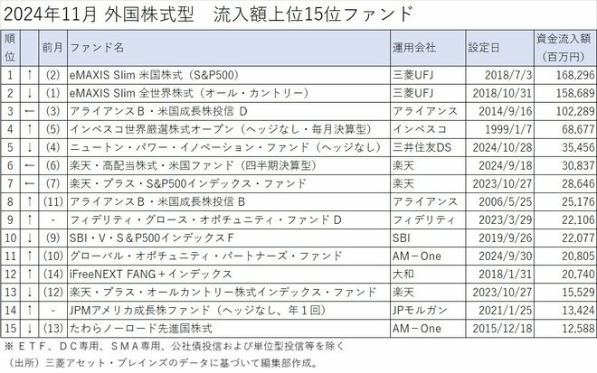 三菱アセット・ブレインズが発表する「投信マーケット概況」で「外国株式型」に分類されるファンドの2024年11月の月次資金流入額トップは「eMAXIS Slim 米国株式(S&P500)」になった。前月1位の「eMAXIS Slim 全世界株式(オール・カントリー)」は第2位に後退した。「eMAXIS Slim 米国株式(S&P500)」の純資産残高は11月に公募投信(ETF除く)の中で初めて6兆円の大台を超えた。
