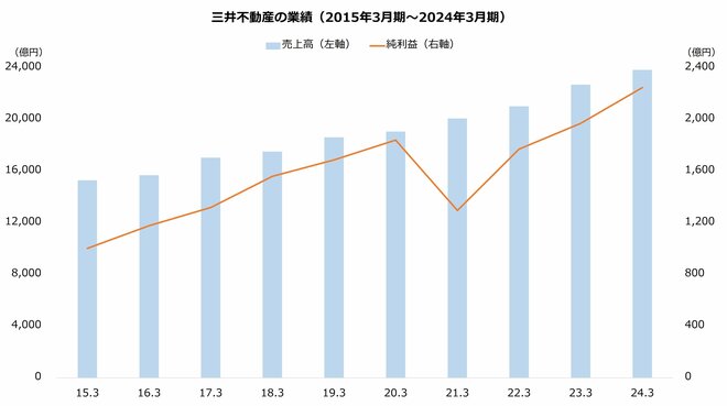 次に業績を解説します。三井不動産は順調に事業を拡大しており、売り上げと利益はおおむね右肩上がりに増加しています。