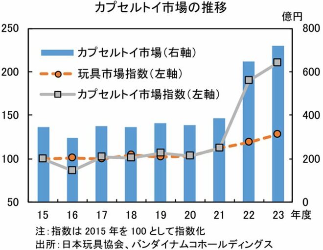 神様:しかし、日本に登場した後、日本で独自の進化を遂げたと言えるでしょう。カプセルトイは1960年代以降、何度もブームを生み出します。そして、今またカプセルトイ市場が国内で急成長しています。市場の推移を見ると、2023年度は720億円となり、2015年度の2.1倍の水準に増加しています。玩具市場全体では27.3%増でしたから、カプセルトイ市場の成長は玩具市場全体の成長ペースを大幅に上回っています。