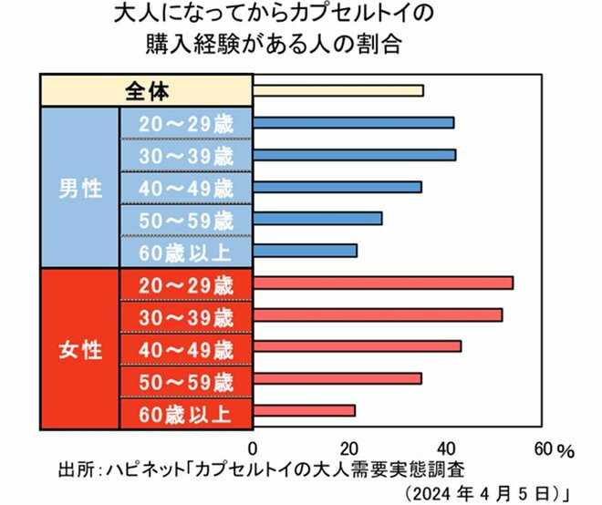 神様:中には紙幣を使用するタイプも登場し、高単価化が進んでいます。裏を返せば、それだけクオリティが高くなっているとも言えます。カプセルトイ市場の隆盛の背景には、ユーザー層の拡大があります。アニメの登場人物などを活用したグッズの開発が盛んに行われ、思わず欲しくなるようなアイテムが大人の興味を惹きつけています。ハピネット「カプセルトイの大人需要実態調査」の2024年版によると、20代30代女性の2人に1人が、大人になってからカプセルトイを購入したことがあるそうです。男性も含めた20代~60代以上の全年齢で見ても、3割超が購入したことがあると回答しています。