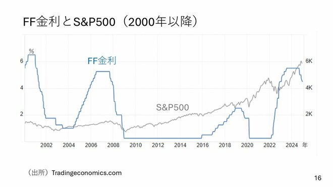 実際に2000年、S&P500と米国の政策金利を見ると、金利の利上げ局面で株が下がっているかというと、全くそういうことはありません。例えば2004年以降、17回連続で利上げをしたとき、少しペースは鈍いですが、株は上がっています。それから2016年以降の利上げ局面でも株は上がっているということになります。なんとなくその日の相場の説明の中で、金利が上がって株が下がった、こういう言い方はよく出てくるのですが、長い目で見ると、そんなに金利が上がるから株が下がると考える必要はないのですが、ただ今週はやはり、先ほどからの話の通り、FOMCのスタンスが予想以上に少しタカ派に転じたので、マーケットも一旦驚いたということだと思います。