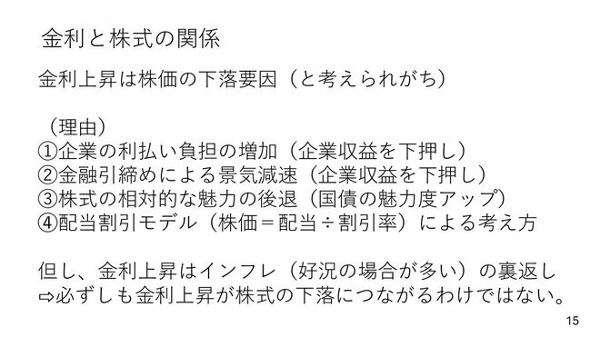 2番の金利が上がるということは、金融引き締め効果によって景気そのものが減速する、そもそも企業収益が圧迫されるのではないかということ。それから3番目、金利が上がると相対的に株というリスク資産と安全資産の国債を比べたときに、金利が高いほど、何もリスクを取って株に投資しなくてもいいのではないか、国債の魅力度が増すわけです。ですので、金利が上がると株ではなくて、リスクを取らずに安全資産の国債にお金が流れて、株が下がるという側面もあります。