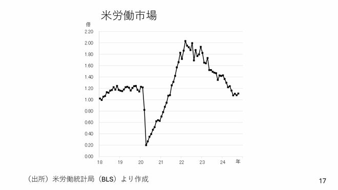 この表には説明が出ていないのですが、求人件数が失業者の何倍あるかという倍率を示しています。これを見ると、ピーク時の2倍から、今大体1倍近辺まで下がってきています。これはコロナ前の水準がだいたい1.2倍ですので、それよりも少し下がってきています。インフレは確かに心配なのですが、やはり労働市場の景気も少し警戒して見ておく必要はあると思います。2025年は本当に利下げが1回で済むのかというと、2回ぐらいはあってもおかしくないと思いますので、やはりここからのポイントは、米国の景気は非常に重要になってくると思います。