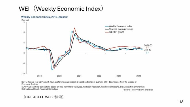 その上で、米国の景気を補足する経済指標ですが、これもこのマーケットトークで一度ご紹介したことがあります。週次で米国の経済状況、景気を補足するのに適しているウィークリーエコノミックインデックスという指標です。これは左下に書いていますが、ダラス連銀が出していますから、ダラスFED WEIと検索するとすぐに出てきます。これを見ると、今のところ米国経済は底堅く推移していますので、急速な失速するというところまで心配する必要はないと思いますが、ただ、本当に利下げがあと1回あるかないかという程度だとすると、米国景気にもやはり少し目配せはしておく必要があるのではないでしょうか。