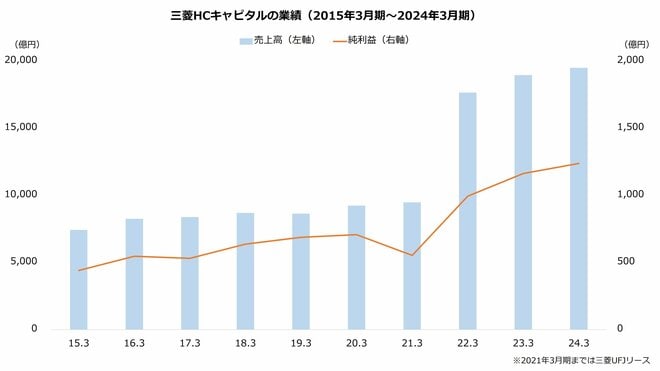 三菱HCキャピタルの業績は2022年3月期に大きく拡大しました。これは日立キャピタルとの統合が主因です。また同年に海上コンテナリース大手の米CAI社を連結子会社化したことも影響しています。