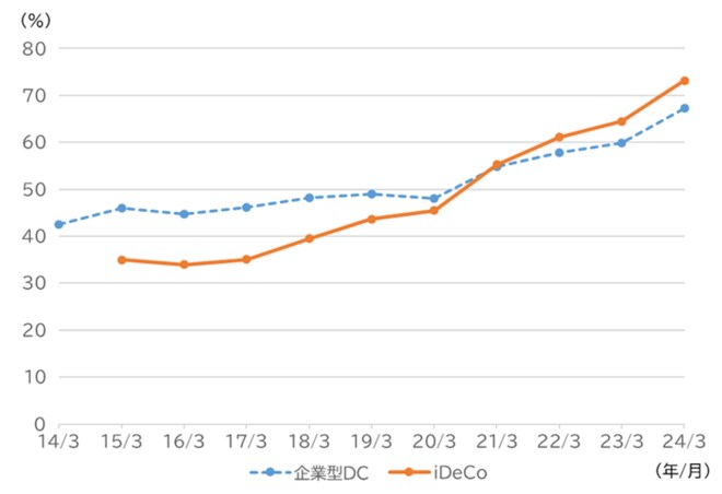 ただ、NISA口座が増加してきた2020年あたりからは、確定拠出年金の投資信託等の比率も上昇を始めており、2024年3月末には企業型DCで67%、iDeCoは73%が投資に振り向けられるようになりました。