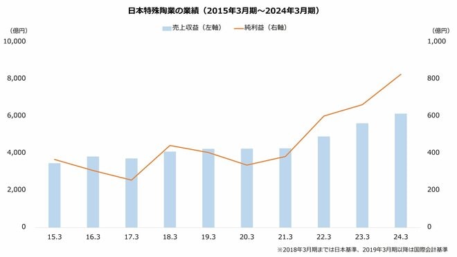 日本特殊陶業は利益が拡大傾向にあります。純利益は2024年3月期に800億円を超え、過去最高を3期連続で更新しました。売り上げより利益の増勢が強いことから、利益率も向上していることがわかります。