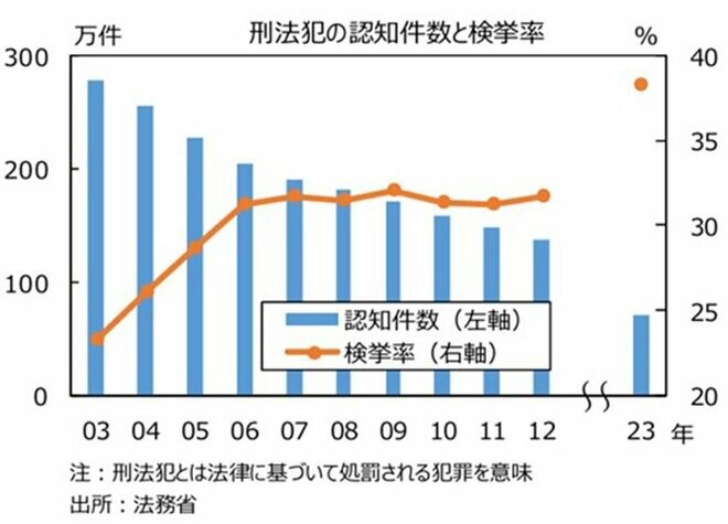 神様:法務省の「犯罪白書」を見るとよくわかるのですが、日本の刑法犯の認知件数は1996年から増加し続け、2002年には約285万件まで増えました。しかし、2003年からは減少に転じ、2015年から2021年までは毎年戦後最少を更新しました。