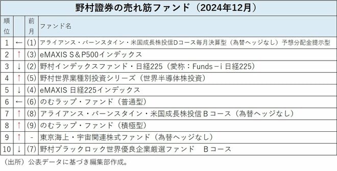 野村證券の投信売れ筋ランキングの2024年12月は、トップの「アライアンス・バーンスタイン・米国成長株投信Dコース毎月決算型(為替ヘッジなし)予想分配金提示型」は変わらなかったものの、前月第2位だった「野村インデックスファンド・日経225(愛称:Funds-i日経225)」は第3位に後退し、前月は第4位だった「eMAXIS 日経225インデックス」も第5位に後退した。代わりに、「eMAXIS S&P500インデックス」が第3位から第2位に、「野村世界業種別投資シリーズ(世界半導体株投資)」が第5位から第4位に浮上した。ランキング上位では国内株ファンドが順位を落とし、米国株を中心に投資するファンドが順位を上げた。一方、新規のトップ10ファンドとして第9位に「東京海上・宇宙関連株式ファンド(為替ヘッジなし)」が入ったことが注目される。