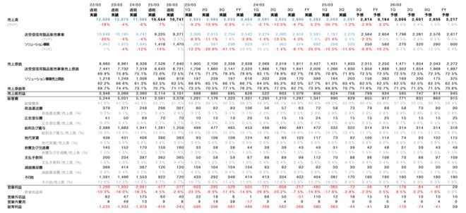 以上の構造改革効果の通年寄与とローカル5G需要の本格化により、来期2026年3月期は、売上高10,700百万円と営業赤字277百万円を予想した。