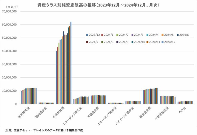 三菱アセット・ブレインズがまとめた2024年12月の公募ファンドの純資産残高は110兆2770億円で前月比3兆6393億円増加して史上最高を更新した。増加額は前月の4760億円増からは大きく増加した。資産別には「外国株式型」が約62兆2003億円と前月から3兆1439億円増加した。次に残高が大きい「国内株式型」は約12兆1926億円で前月比2555億円の増加、「複合資産型」は約12兆1887億円と前月比2090億円増だった。「外国株式型」の残高増が際立っている。