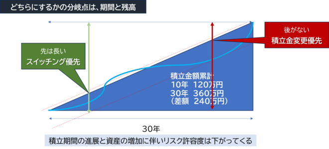 加入者資格喪失の年齢に近づいている方は、運用期間も残り少ないことから、リスク許容度(リスクを受け入れられる度合い)が低くなります。この状況で過去に購入した定期預金分も根こそぎスイッチングしてしまうと、リターンがブレた時にマイナスも大きくなる可能性があります。受け取りを目前にして日々のストレスが増えてもよくないため、今後の積立金の変更を優先して考えてみるのが良いでしょう。