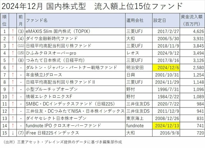 三菱アセット・ブレインズが発表する「投信マーケット概況」で「国内株式型」に分類されるファンドの2024年12月の月次資金流入額トップは「eMAXIS Slim 国内株式(TOPIX)」になった。前月トップだった「日経225ノーロードオープン」は上位15位から姿を消し、全体的に「国内株式型」への資金流入量が減った。その結果、前月はトップ15ランキングに入っていなかったファンドが9ファンドも新規にランクインするということになった。