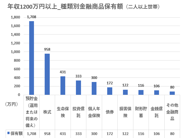 金融商品(種類別)保有額ランキング(年収1200万円以上、二人以上世帯)