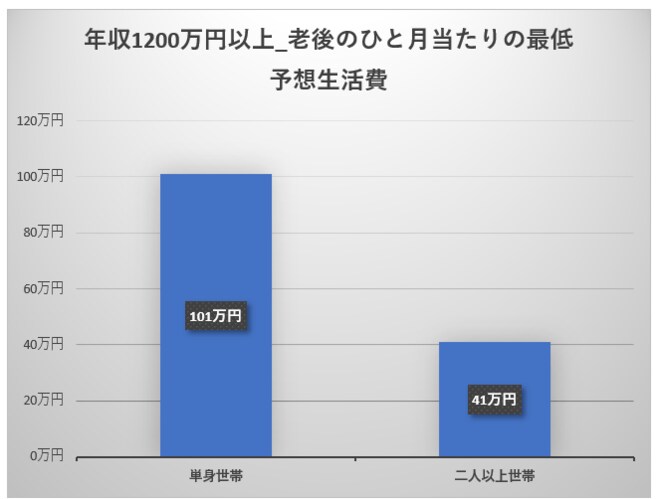 老後のひと月当たりの最低予想生活費について、年収1200万円以上の単身世帯は101万円、二人以上世帯では41万円と回答しています。この金額が多いのか少ないのか、ほかの年収帯の世帯と比較してみましょう。